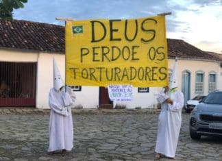 Dois indivíduos que, vestidos como membros da organização racista norteamericana Ku Klux Kan, saíram pelas ruas da cidade, no dia 1º de maio deste ano, com faixa escrita “Deus perdoe os torturadores”.O inquérito policial foi remetido ao Poder Judiciário para a adoção das providências cabíveis