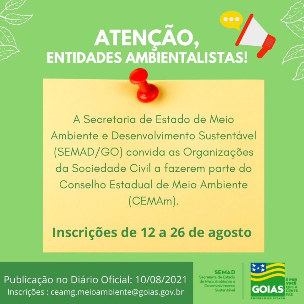 Secretaria Estadual de Meio Ambiente e Desenvolvimento Sustentável (Semad) recebe, a partir da próxima quinta-feira (12), inscrições para o processo seletivo de Organizações da Sociedade Civil interessadas em compor o Conselho Estadual do Meio Ambiente (CEMAm). Solicitações devem ser enviadas para o e-mail ceamg.meioambiente@goias.gov.br.