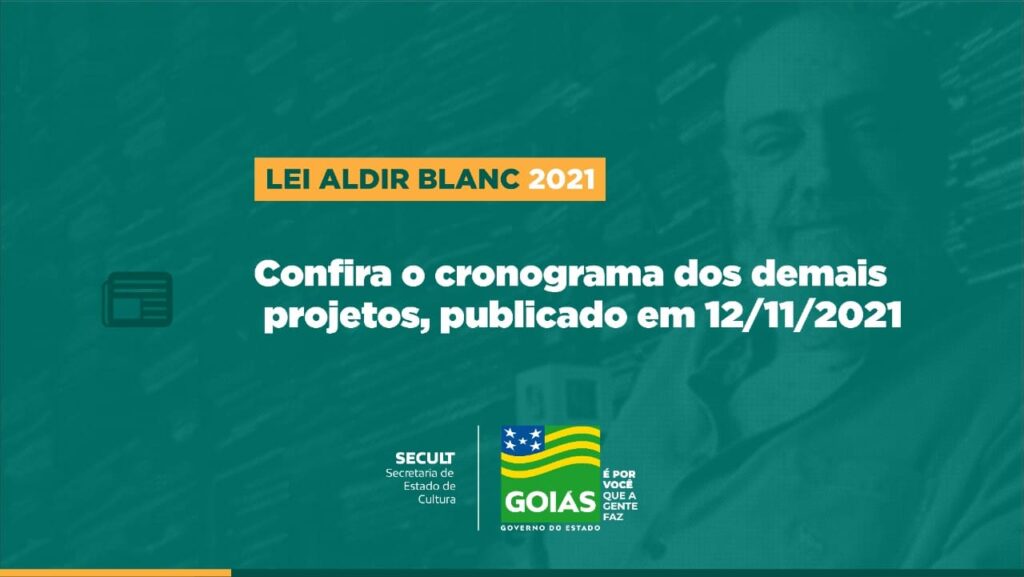 O Governo de Goiás, por meio da Secretaria de Estado de Cultura (Secult), divulgou, no Diário Oficial desta sexta-feira (12), o novo cronograma dos editais da Lei Aldir Blanc 2021. O período de avaliação dos projetos começou no dia 10 de novembro e segue até o dia 16. A divulgação do resultado final está prevista para o dia 30 de novembro