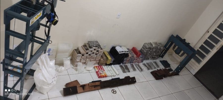 No local, foram apreendidos mais de 200 quilos de drogas. Os ilícitos estavam em uma residência do Setor Jaó, localizada por equipes do 42º Batalhão de Polícia Militar (42º BPM) após o recebimento de denúncia anônima