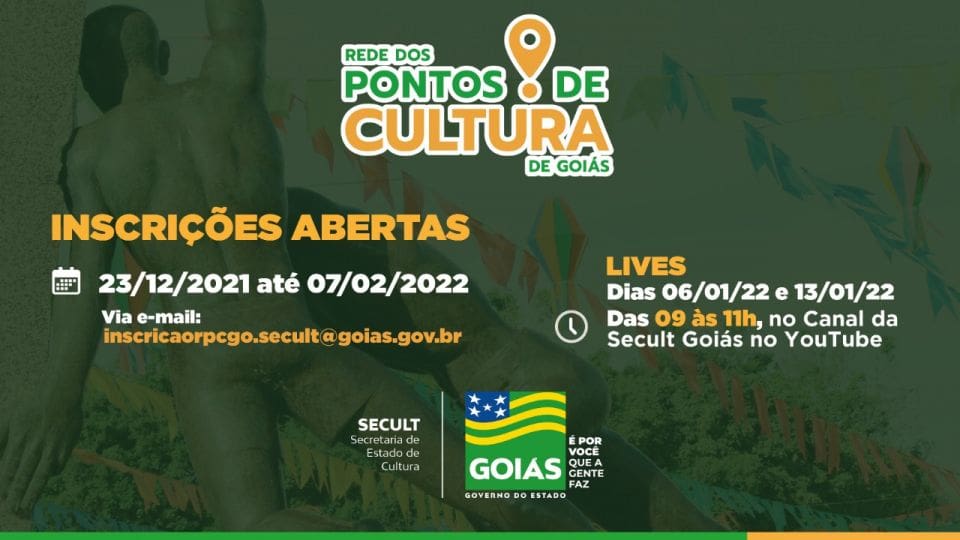 Inscrições ao pleito podem ser feitas até dia 7 de fevereiro de 2022, somente pelo e-mail: inscricaorpcgo.secult@goias.gov.br. Para orientar e esclarecer dúvidas sobre o novo Edital, a Secult realizará lives nos dias 6 e 13 de janeiro, pelo canal do YouTube da secretaria