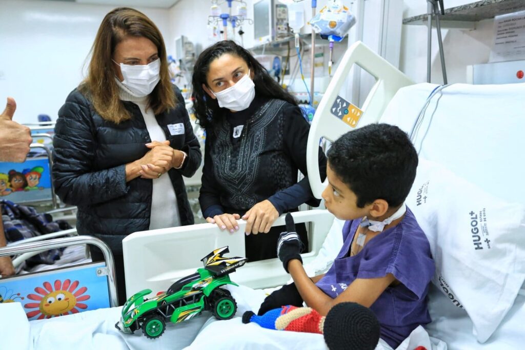 Gracinha Caiado dedicou agenda na manhã desta segunda-feira (23/05) para acompanhar de perto o progresso do quadro clínico do garoto de 9 anos, internado após acidente durante atividade do Projeto Bombeiro Mirim. Na ocasião, primeira-dama também visitou o jovem Gabriel Moreira, de 12 anos, que teve pernas amputadas após um acidente de carro