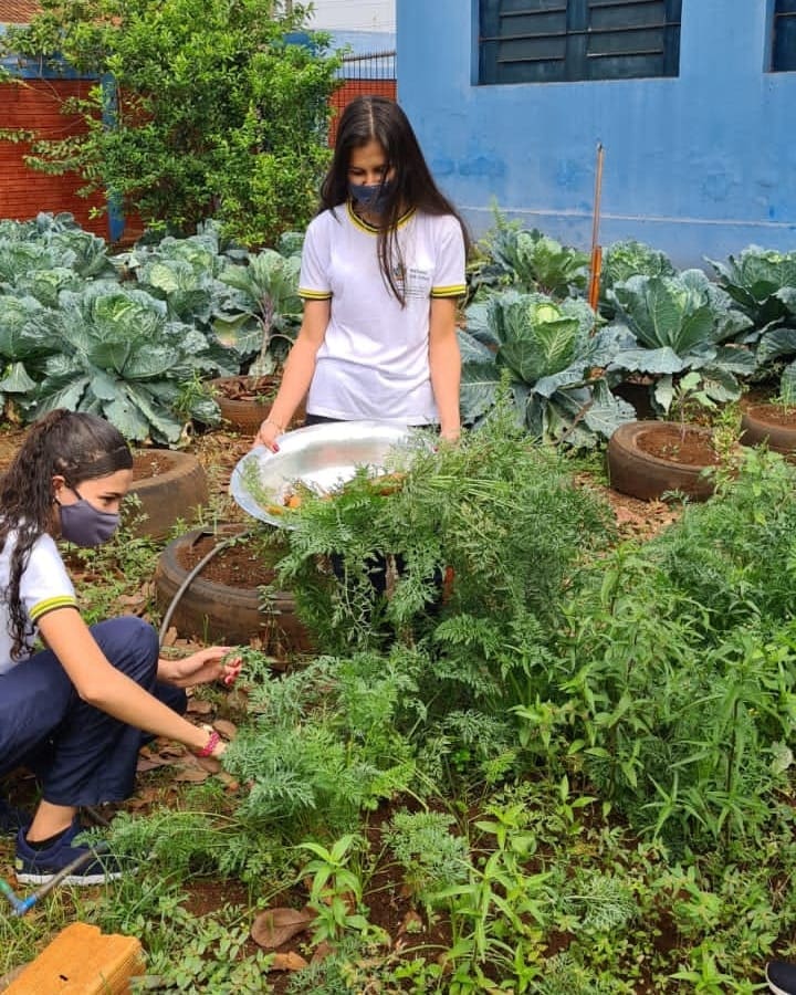 Os cuidados com as hortas juntam toda a comunidade escolar: gestores, professores e servidores, alunos e pais de alunos. “O cultivo também faz parte de atividades pedagógicas, quando os professores da disciplina de Ciências envolvem seus alunos na melhoria da produtividade das hortas”.