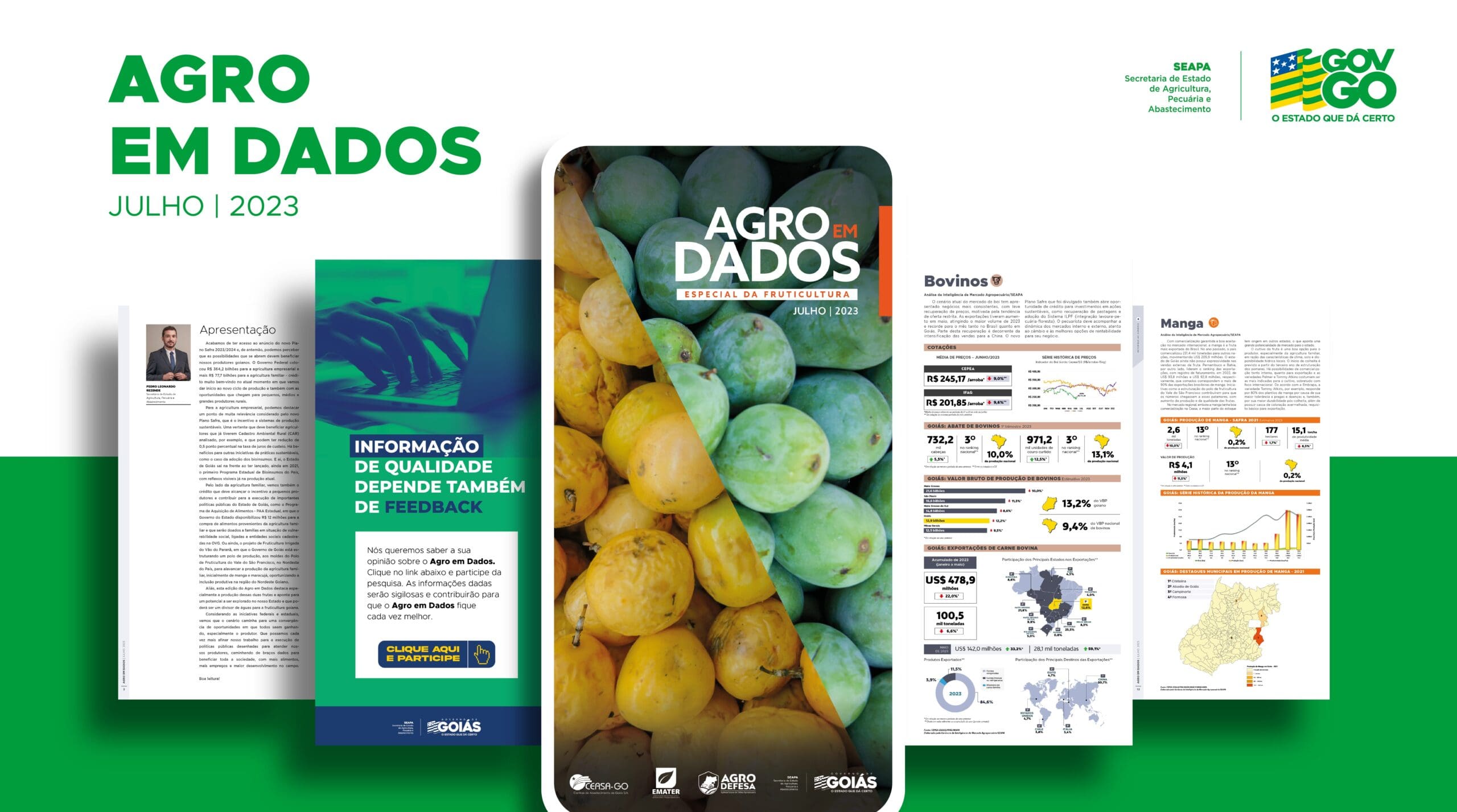 A edição de julho do Agro em Dados está disponível no site da Seapa: https://www.agricultura.go.gov.br/files/2023/AgroEmDados23/JULHO-2023-AGRO-EM-DADOS.pdf