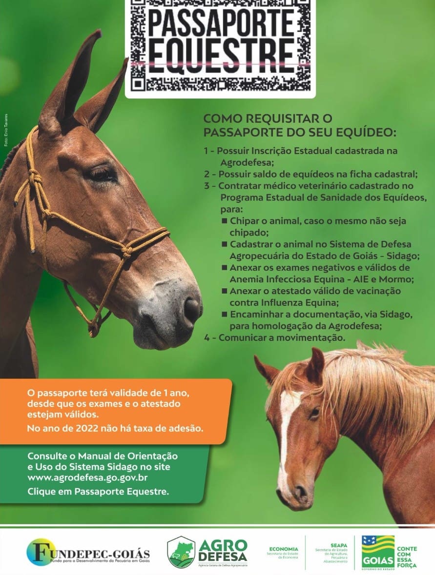 Em parceria com a Secretaria da Agricultura, Pecuária e Abastecimento (Seapa-Goiás), Secretaria da Economia e Emater-Goiás e apoio financeiro do Fundo para o Desenvolvimento da Pecuária em Goiás (Fundepec), a Agência começa a divulgar o Passaporte Equestre a partir desta segunda-feira (27), com o objetivo de mostrar aos criadores de equídeos as facilidades para obtenção do documento e vantagens para os deslocamentos dos animais.