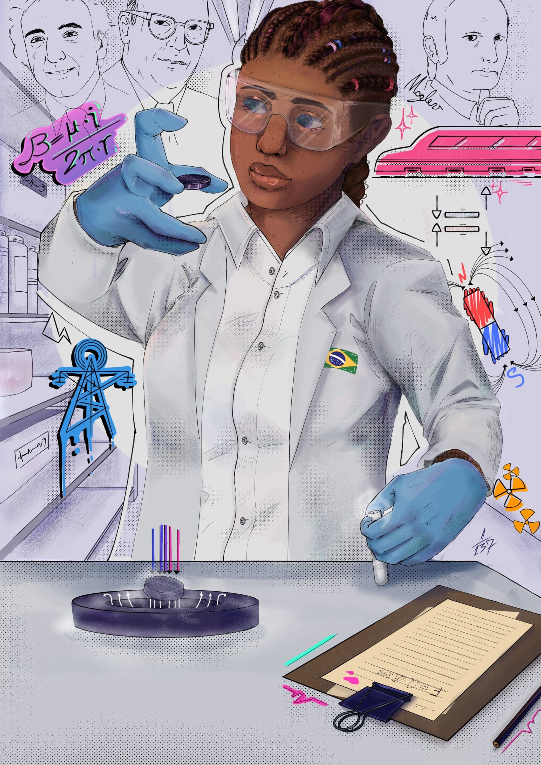 “No mês que fiz o desenho, estava estudando sobre supercondutividade e supercondutores. Também havia assistido muitos vídeos e matérias a respeito, por isso resolvi aplicar um pouco de toda essa inspiração visual. E podíamos desenhar cientistas, então coloquei também três importantes pesquisadores da área”, explicou a jovem.