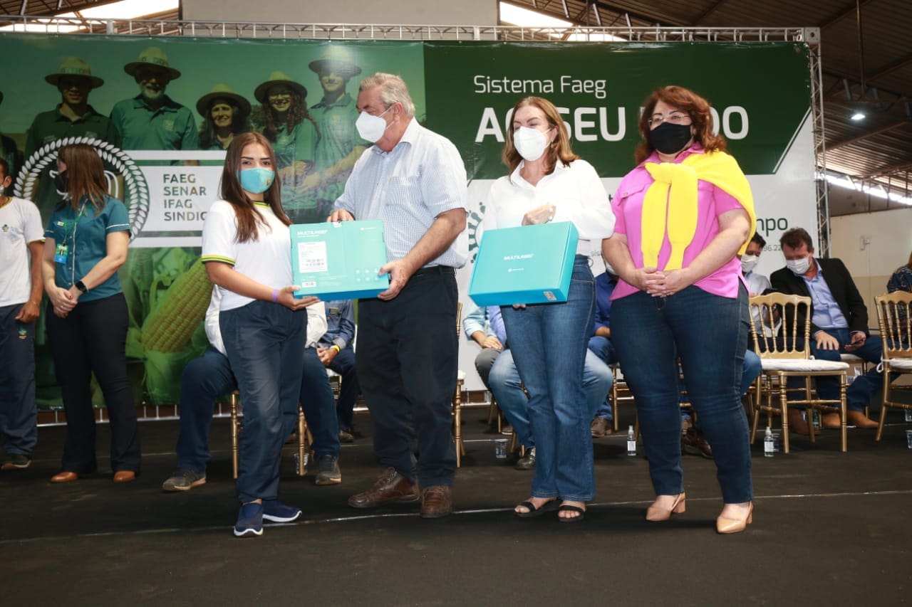 A entrega foi feita pela secretária Fátima Gavioli, de forma simbólica, aos alunos Geovana Alves Rosa e Gustavo de Moraes, durante evento realizado no Parque Agropecuário da cidade, dentro das comemorações dos 70 anos da Federação da Agricultura do Estado de Goiás (Faeg), da qual a secretária era uma das convidadas, representando o governador Ronaldo Caiado.