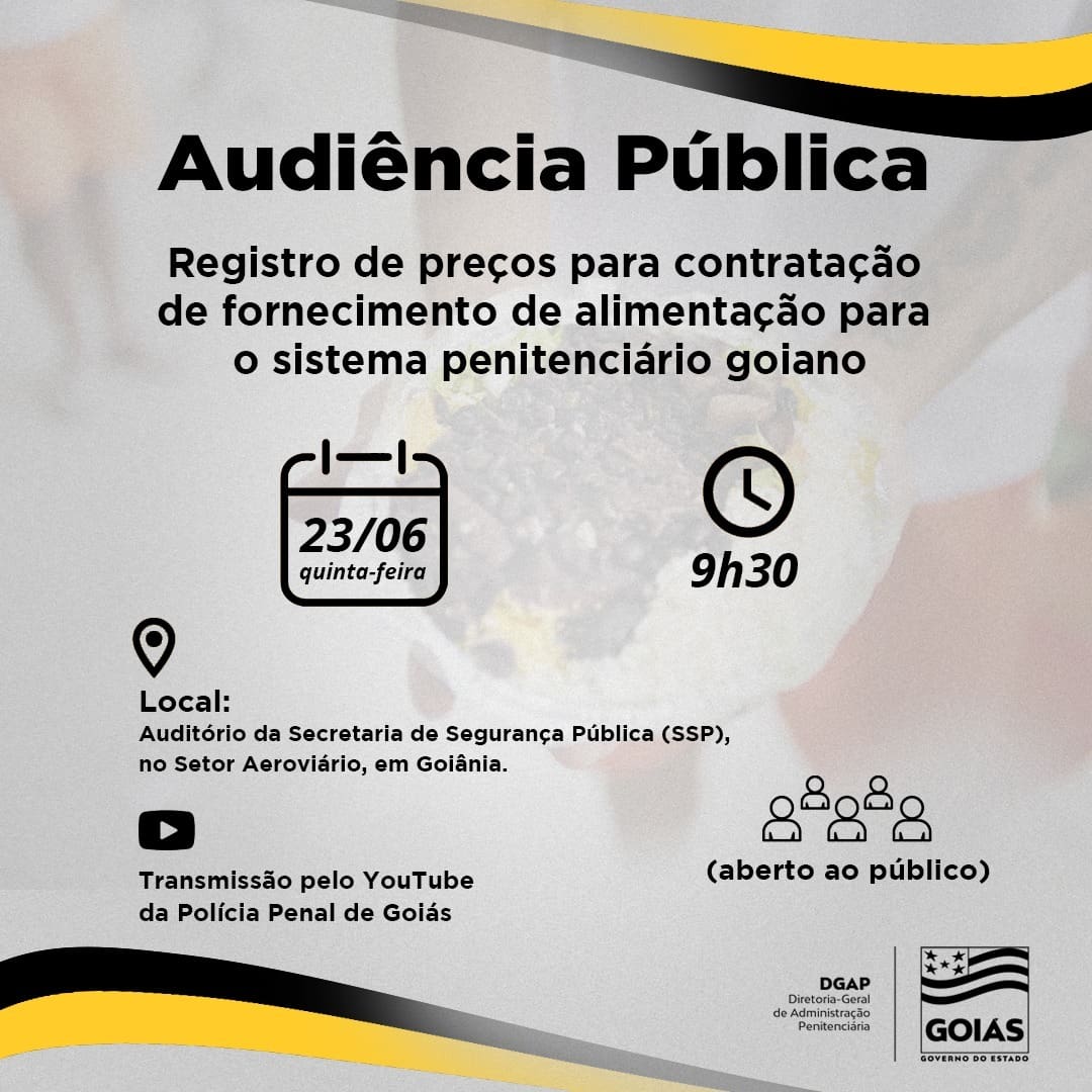 A primeira audiência pública para tratar sobre o registro de preços para contratações de empresas especializadas no fornecimento de alimentação para o sistema penitenciário goiano será realizada no próximo dia 23 de junho. O evento será no auditório da Secretaria de Segurança Pública (SSP), no Setor Aeroviário, em Goiânia, às 9h30. A audiência também terá transmissão, ao vivo, pelo YouTube da Polícia Penal.