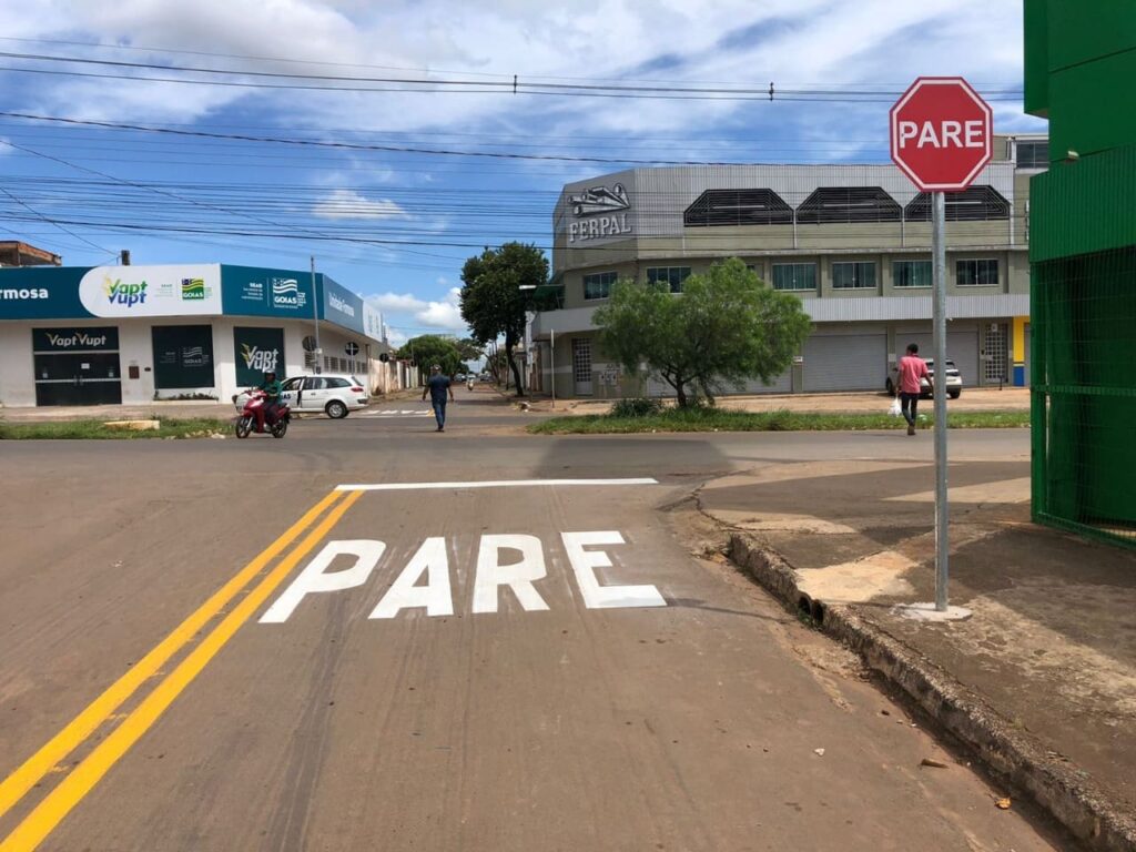 Sinalização gráfica horizontal é implantada sobre o pavimento para o controle, advertência e orientação ou informação, como faixa de pedestres, faixas contínuas ou intermitentes. Município também recebeu 532 placas de sinalização vertical