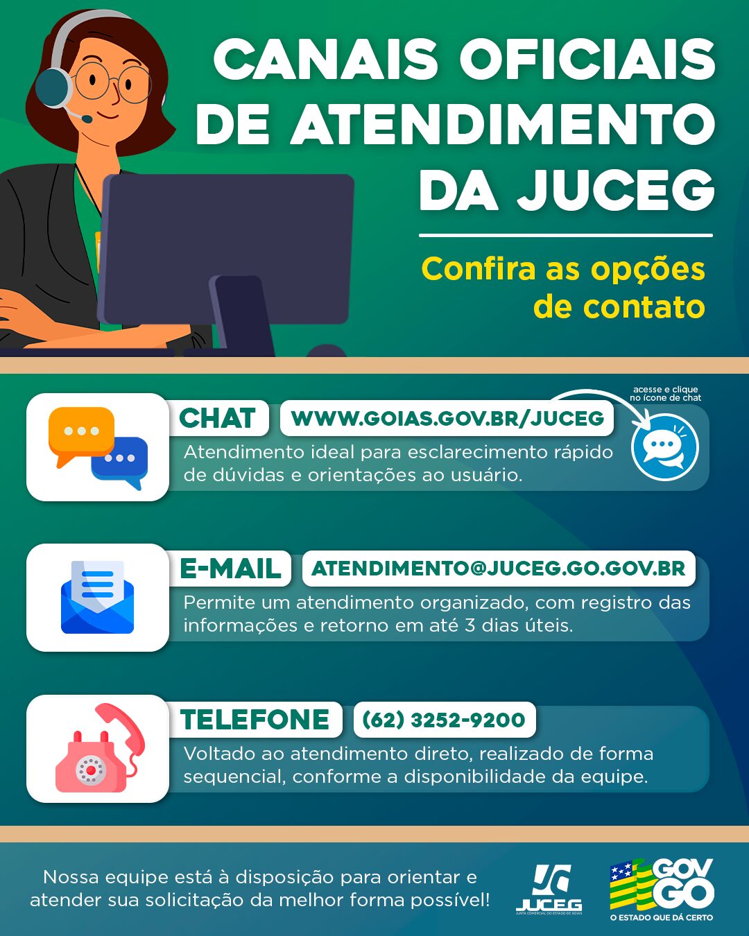 O chat online, no site www.goias.gov.br/juceg, é ideal para dúvidas rápidas e orientações gerais. Basta acessar e clicar no ícone do chat.