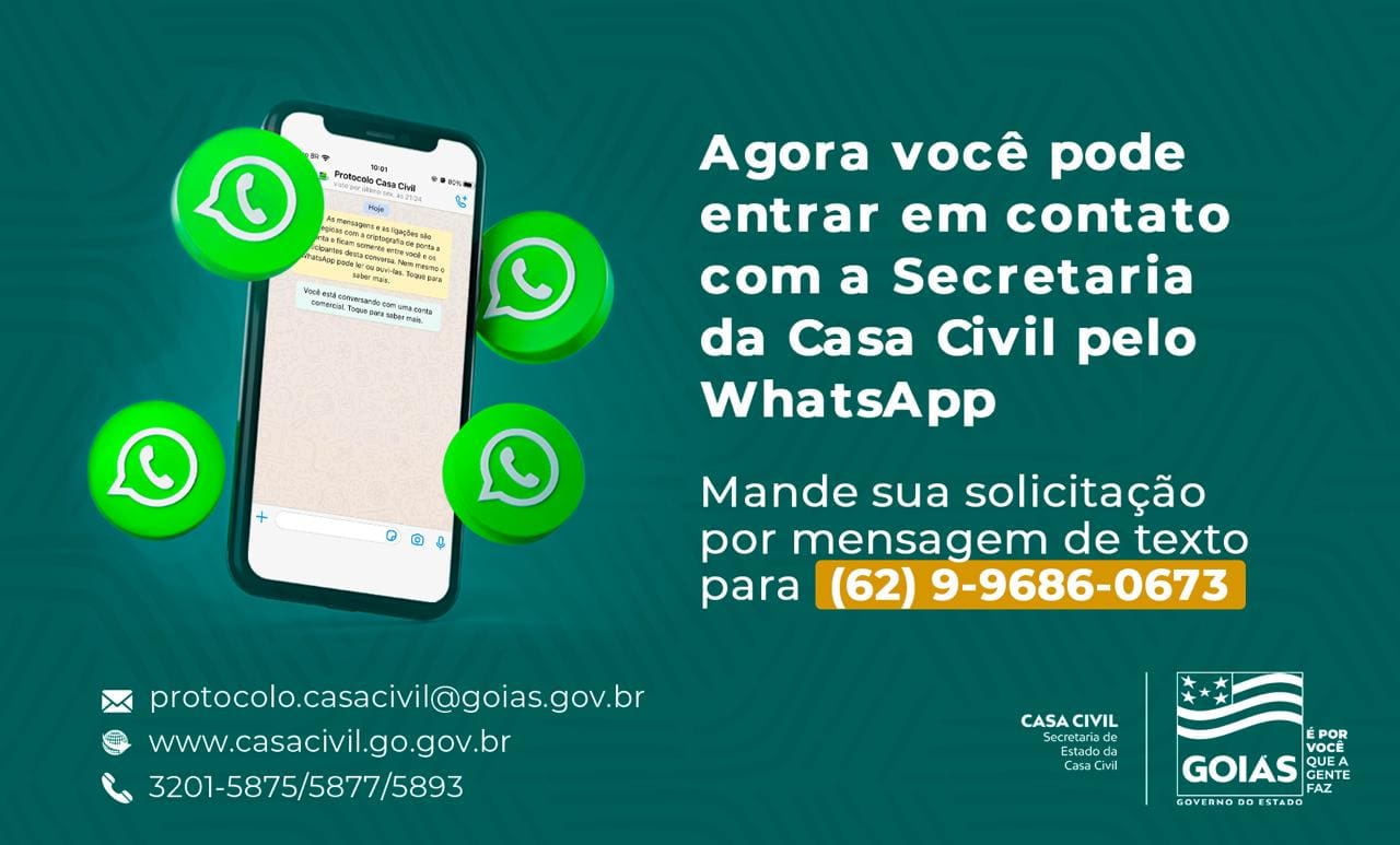 Com o intuito de estar cada vez mais próximo do cidadão e facilitando o acesso de todos à informação, a Secretaria de Estado da Casa Civil do Governo de Goiás anuncia o lançamento do WhatsApp da Gerência de Protocolo, Documentação e Arquivo. O serviço está disponível por meio do número (62) 9-9686-0673 ou no WhatsApp Web, pelo link https://wa.me/5562996860673.
