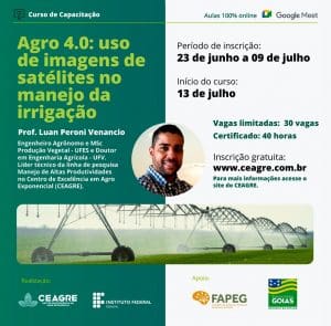 Voltado para estudantes de todos os níveis de ensino, o curso visa habilitar o participante a fazer uso correto das principais ferramentas e tecnologias do Agro 4.0 que estão sendo aplicadas para o manejo e monitoramento de grandes áreas irrigadas nas principais fazendas brasileiras e mundiais.