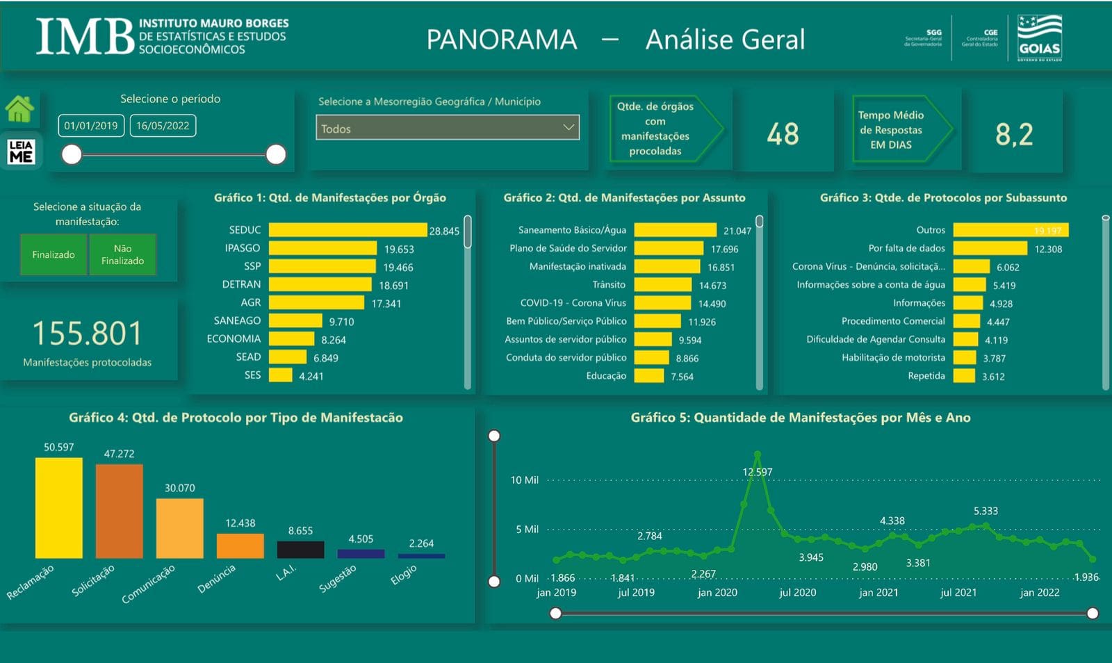 A Controladoria-Geral do Estado (CGE) disponibiliza à sociedade o Painel de Dados Estatísticos da Ouvidoria-Geral do Estado, fruto de parceria com o Instituto Mauro Borges de Estatísticas e Estudos Socioeconômicos (IMB). A ferramenta, que é de uso público, fornece ao cidadão acesso a dados e estatísticas registrados pelas ouvidorias setoriais do Poder Executivo estadual (pedido de acesso à informação, reclamação, denúncia, sugestões, elogios, solicitação e comunicação). O painel permite análises, acompanhamento ou qualquer tipo de estudo ou ação que dependa de informações do Sistema de Ouvidoria, tabuladas e sistematizadas a partir de diversos filtros e indicadores.