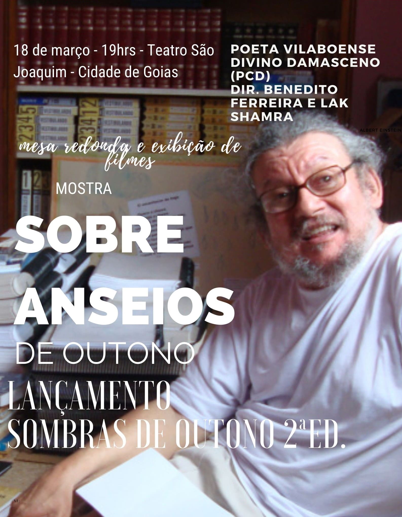 O Cine Teatro São Joaquim, unidade da Secretaria de Estado da Cultura (Secult Goiás) na cidade de Goiás, recebe nesta sexta-feira (18/3), a Mostra “Sobre Anseios d’Outono”. Com mesa-redonda e filmes, o evento trabalha, principalmente, a unicidade e multiplicidade lírica de escritores portadores de deficiência física no cinema e na literatura a partir dos poemas de Divino Damasceno.
