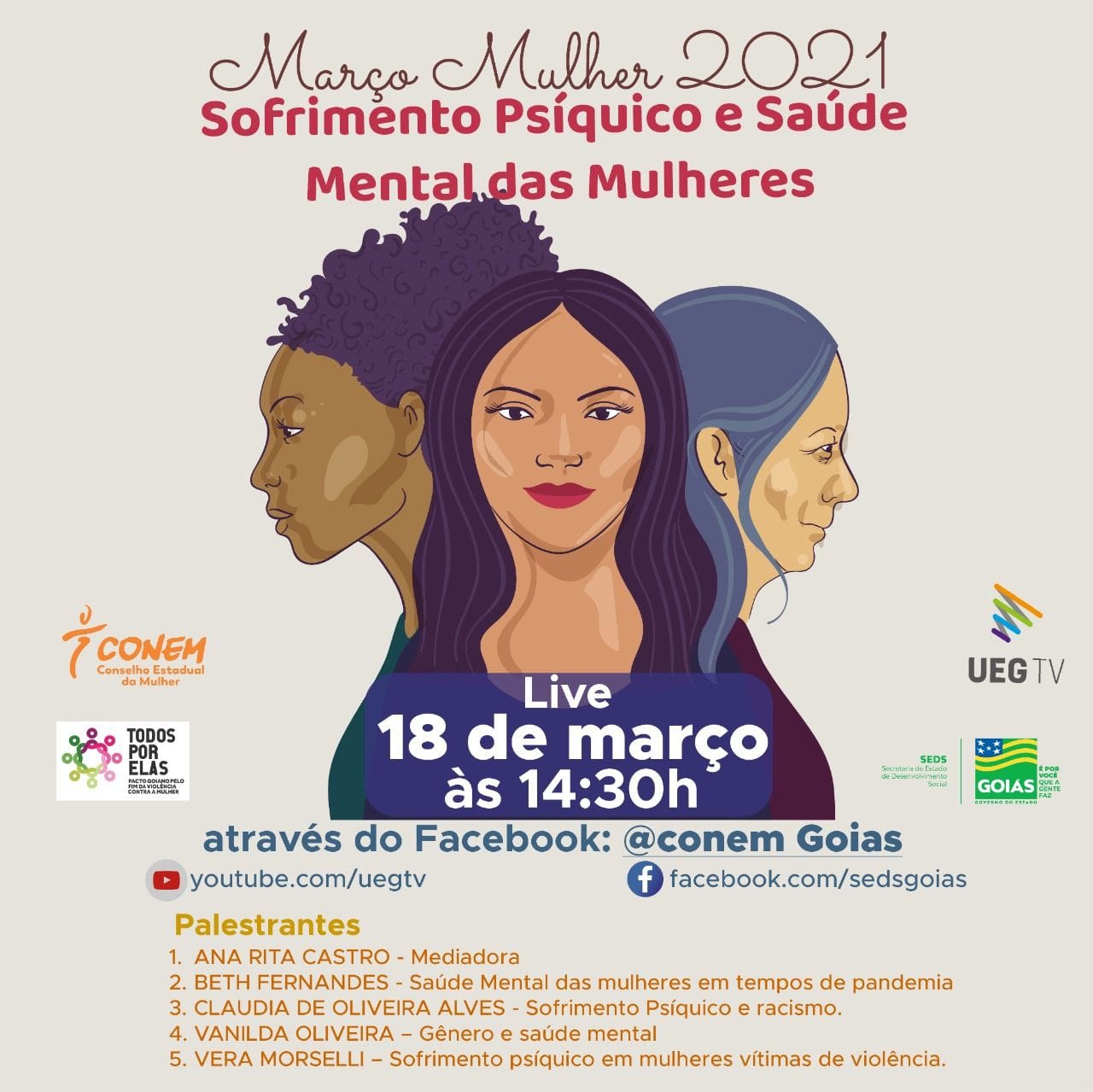 O Conselho Estadual da Mulher de Goiás (Conem), em parceria com a Universidade Estadual de Goiás (UEG), realizará nesta quinta-feira, 18, às 14h30, mais uma live do projeto Vacina, Sus e Renda, dentro da programação Março, Mulher 2021. A transmissão será pela UEG TV.