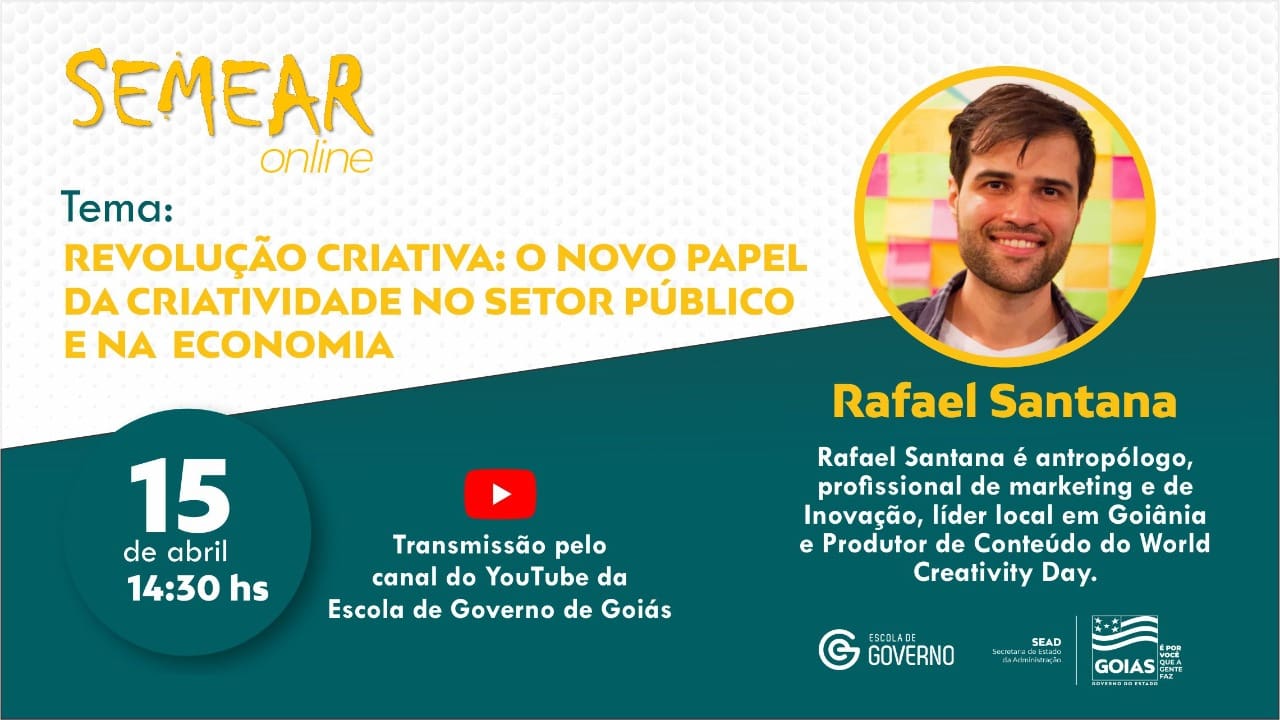 A Secretaria da Administração (Sead), por meio da Escola de Governo de Goiás, realiza no próximo dia 15 de abril mais uma edição do projeto Semear On-line. Em debate, o antropólogo, profissional de marketing e de Inovação, Rafael Santana, vai instruir os servidores acerca da “Revolução Criativa: o novo papel da criatividade no setor público e na economia”. A transmissão ocorre às 14h30, no canal da Escola de Governo no Youtube.