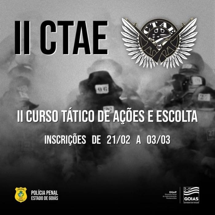 A Diretoria-Geral de Administração Penitenciária (DGAP), por meio da Escola Superior de Polícia Penal (ESPP), abre, nesta segunda-feira (21), as inscrições para o II Curso Tático de Ações e Escolta (CTAE). A capacitação contempla todos os policiais penais efetivos que queiram se especializar e também profissionais das demais forças de segurança pública goiana. O servidor interessado tem até o dia 3 de março para concluir sua inscrição. O curso disponibiliza 92 vagas no total.
