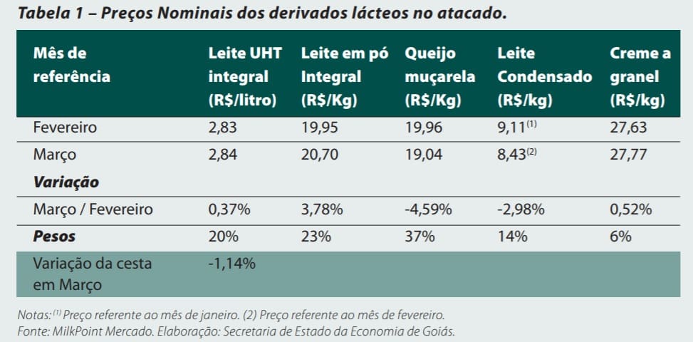 A Câmara Técnica e de Conciliação da Cadeia Láctea de Goiás divulgou nesta sexta-feira, 26 de março, o boletim de mercado do setor lácteo goiano. O índice da cesta de derivados lácteos teve variação total ponderada de -1,14%, no mês de referência de março. O Índice apurado reflete os preços do mês corrente.