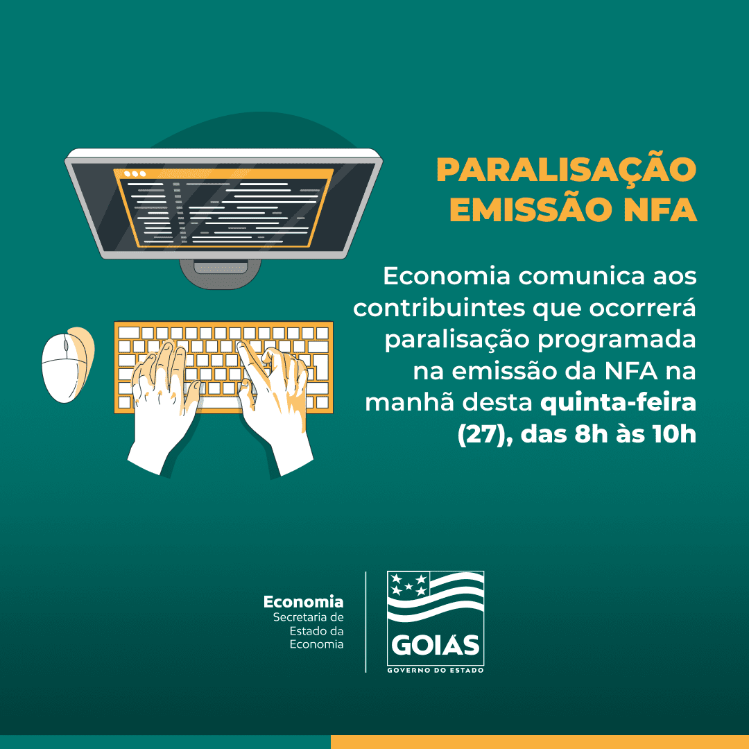 A Secretaria da Economia, por intermédio da Superintendência de Informações Fiscais (SIF), comunica aos contribuintes emissores de Nota Fiscal Avulsa (NFA) que, nesta quinta-feira (27), das 8 às 10 horas, ocorrerá paralisação na emissão do referido documento fiscal, via web.
