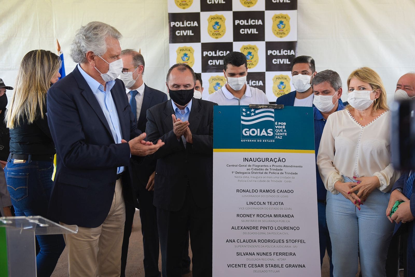 Na segunda agenda do dia, em Trindade, nesta segunda-feira (21), o governador Ronaldo Caiado inaugurou o novo prédio da Central Geral de Flagrantes e da 1ª Delegacia Distrital de Polícia (DDP). “Podem ter certeza que nós vamos transformar a segurança pública, com estruturas que consolidam o bom atendimento dos policiais à toda população”, assegurou o chefe do Executivo.