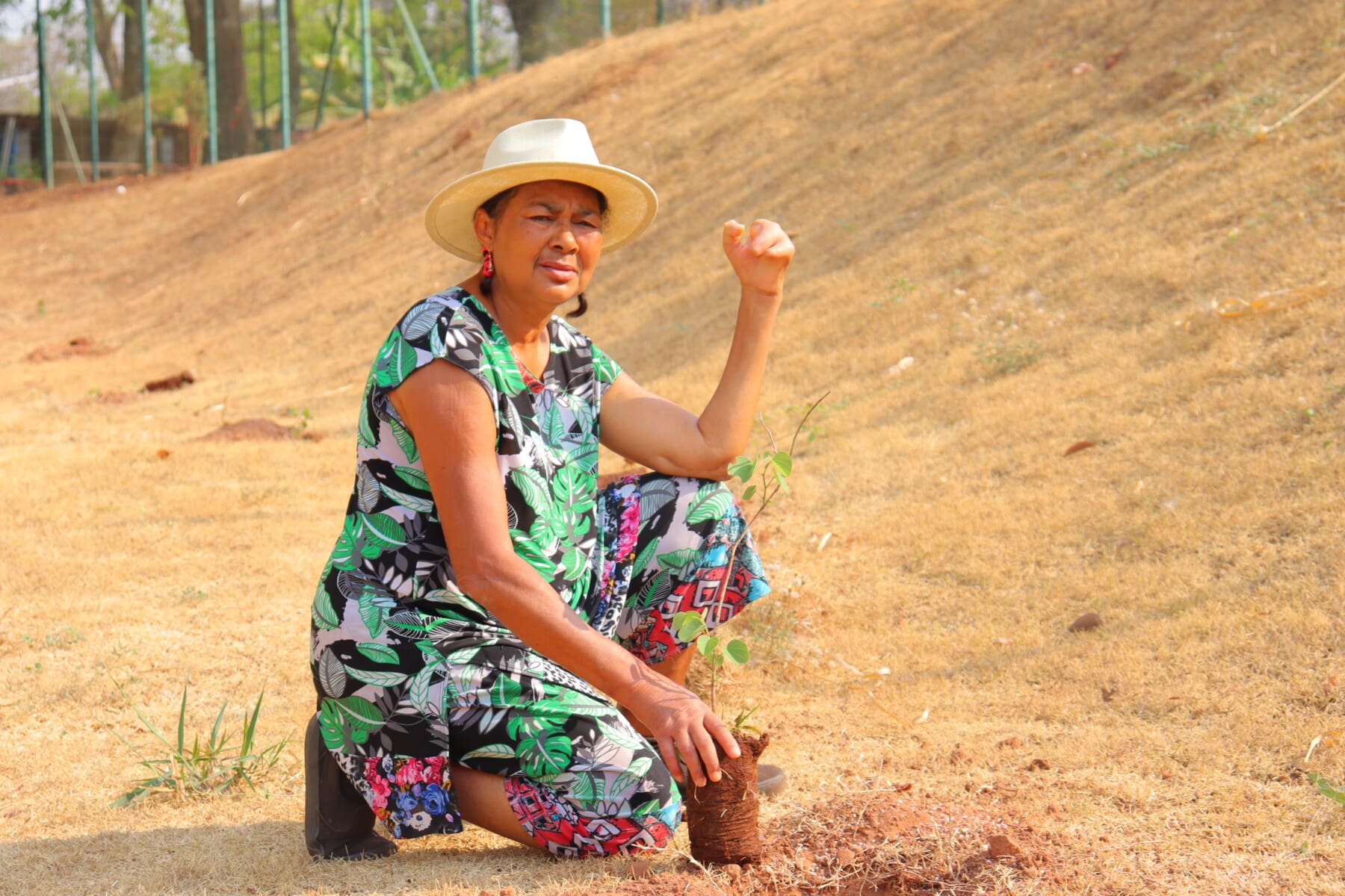 Uma das remanescentes da Colônia Santa Marta, Messias Pereira planta árvore (Foto: Naiclea Luzia Da Silva/Agir)