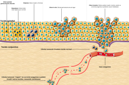 Umas das ilustrações da obra mostra a formação de um tumor maligno, sua migração para corrente sanguínea e sua invasão de outros tecidos (Fonte: Talita Aguiar e Andreia Juliana R. Caldeira)