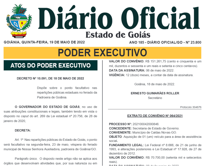 O Governo de Goiás determinou ponto facultativo no dia 23 de maio, segunda-feira véspera do feriado municipal de Nossa Senhora Auxiliadora, padroeira de Goiânia. O decreto 10.091 foi publicado nesta quinta-feira (19), no Diário Oficial do Estado.