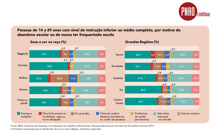 Segundo dados da Pesquisa Nacional por Amostra de Domicílio (Pnad) Contínua 2019, 39% dos jovens que abandonaram os estudos em algum momento o fizeram porque precisavam trabalhar. Enquanto isso, 29,2% pararam de estudar por falta de interesse e 9,9% abandonaram a escola por gravidez.