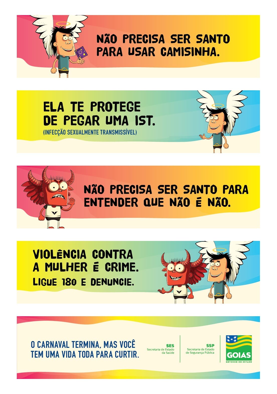 O Governo de Goiás lançou, neste sábado (18/2), a campanha de conscientização “Você não precisa ser santo pra fazer o que é certo”. A ideia é orientar a população, durante o Carnaval, com o objetivo de evitar acidentes, promover a saúde e reduzir crimes contra a mulher com uma mensagem bem-humorada. A ação utiliza de personagens-símbolos dos conceitos de bem e mal, certo e errado para apresentar e defender o mote da campanha.