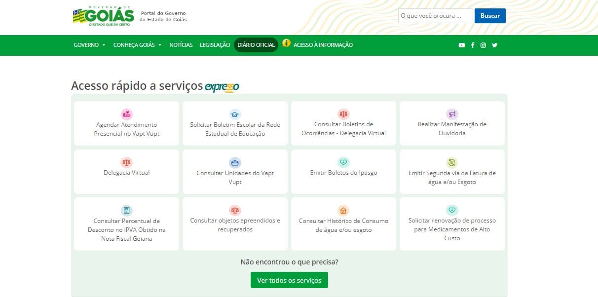 O goias.gov.br disponibiliza acesso a ouvidoria, diário oficial, legislação, vídeos institucionais, agenda do governador, aplicativo Mulher Segura e materiais especiais elaborados pela equipe de comunicação do governo. Serviços, como Vapt Vupt, Ipasgo e Detran, ocupam espaço de destaque.
