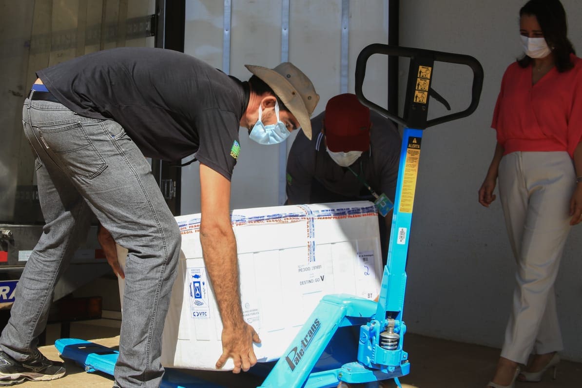 “As doses da CoronaVac vão ser utilizadas, principalmente, para que os municípios regularizem a segunda aplicação, o restante como primeira dose”, diz a superintendente de Vigilância em Saúde de Goiás, Flúvia Amorim, que acompanhou a chegada dos imunizantes.