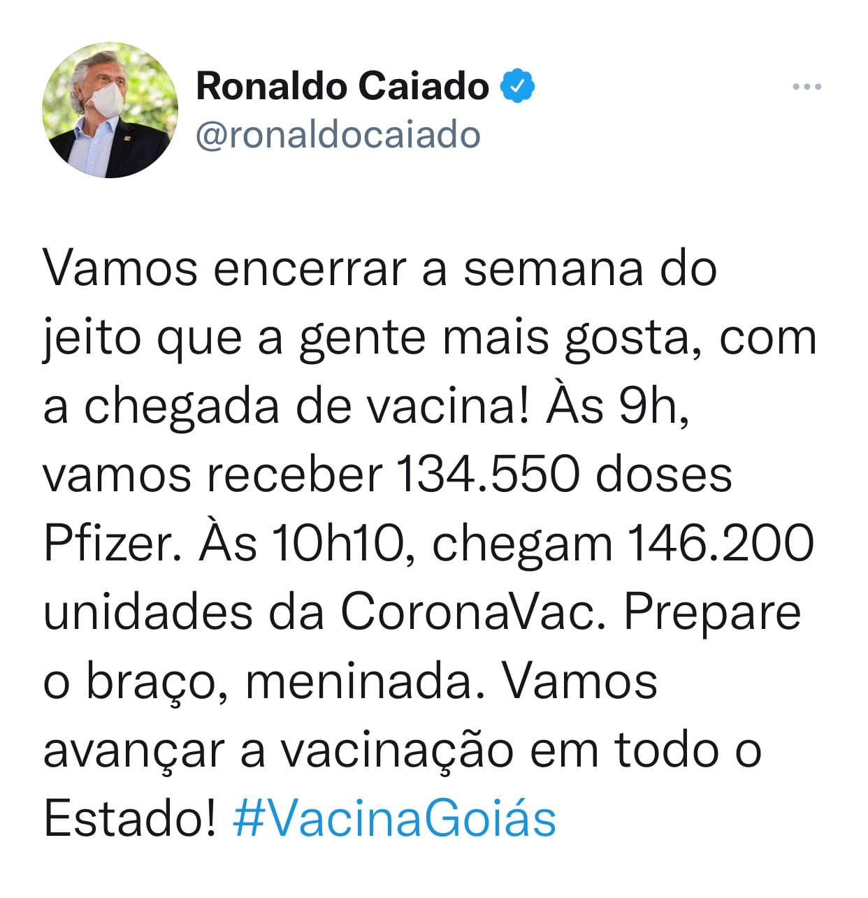 A semana vai terminar com a chegada a Goiás de mais 280.750 doses de vacina contra a Covid-19. Esse foi o anúncio feito pelo governador Ronaldo Caiado em suas redes sociais, na tarde desta quinta-feira (19). Serão 134.550 doses do imunizante Comirnaty, do laboratório Pfizer, com chegada prevista para 9 horas desta sexta-feira (20). Logo em seguida, às 10h10, desembarcam em Goiânia 146.200 da vacina Coronavac, do Instituto Burtantan.