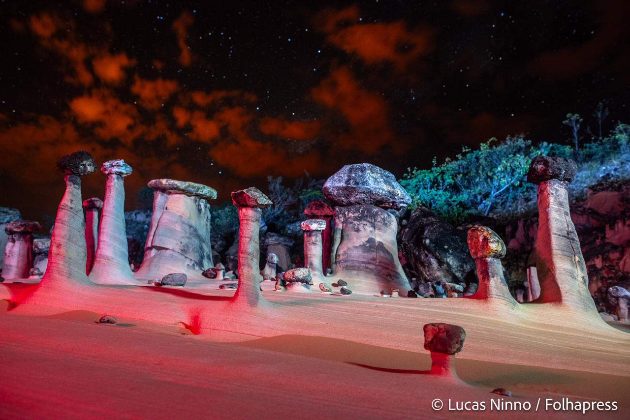 Parece cenário de filme de ficção científica, mas está em Goiás o primeiro conglomerado brasileiro geológico conhecido como “chaminés de fada”, estruturas em que uma torre sustenta rochas arredondadas na ponta.