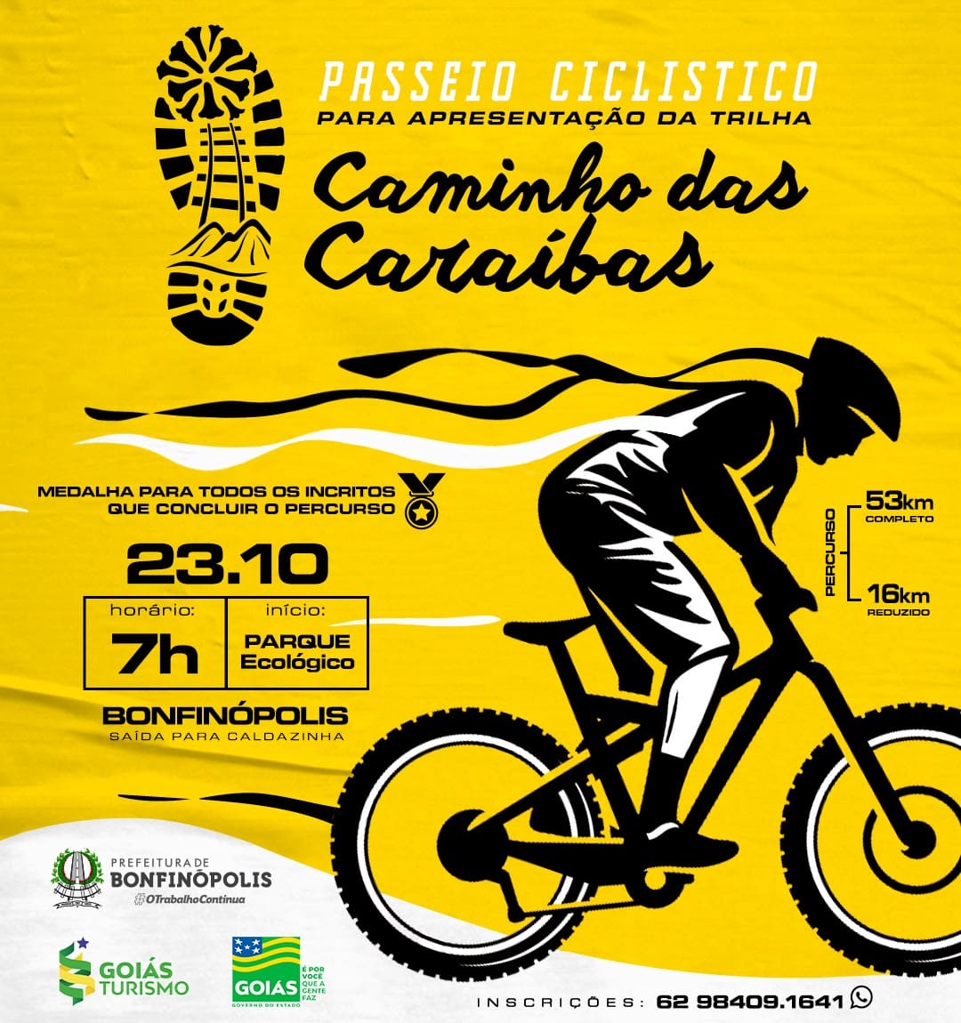 Atletas de vários municípios irão participar do passeio ciclístico no trajeto de até 53 quilômetros, para quem optar em fazer todo a rota, com saída do Parque Ecológico. Os ciclistas, também, poderão escolher o percurso reduzido, de 16 quilômetros. Outra ação será o plantio de mudas de caraíbas, que dão nome ao atrativo. O evento contará com a presença do presidente da Goiás Turismo, Fabrício Amaral, de autoridades locais e representantes do trade turístico.