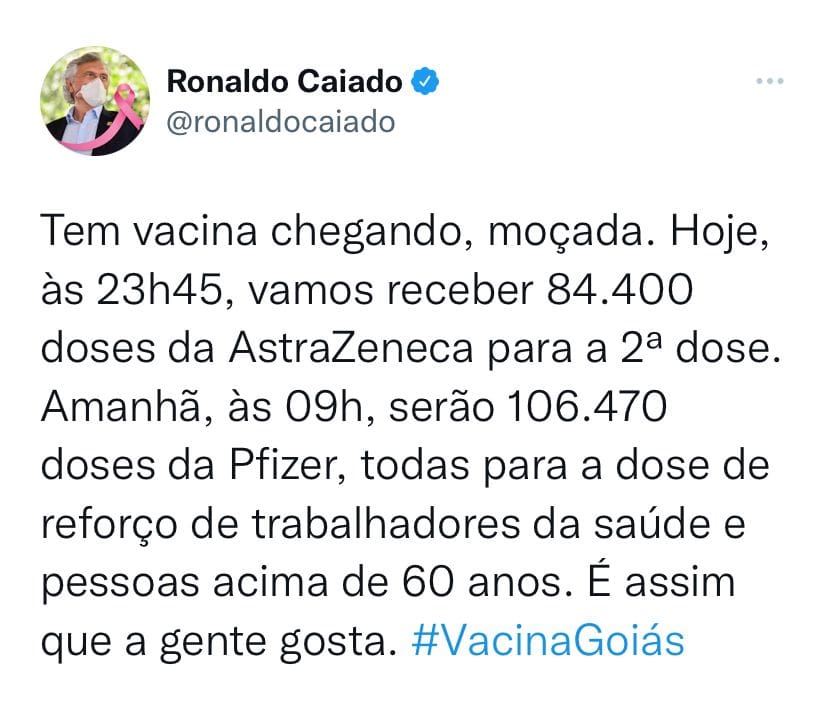 Pelas redes sociais, o governador Ronaldo Caiado anunciou a chegada de mais 190.870 doses de vacinas contra a Covid-19. Nesta sexta-feira (1º), às 23h45, Goiás recebe 84.400 doses da AstraZeneca para aplicação de segunda dose. E no sábado (2), chegam 106.470 vacinas da Pfizer, que serão usadas no reforço da vacinação de trabalhadores da Saúde e em pessoas com mais de 60 anos de idade.