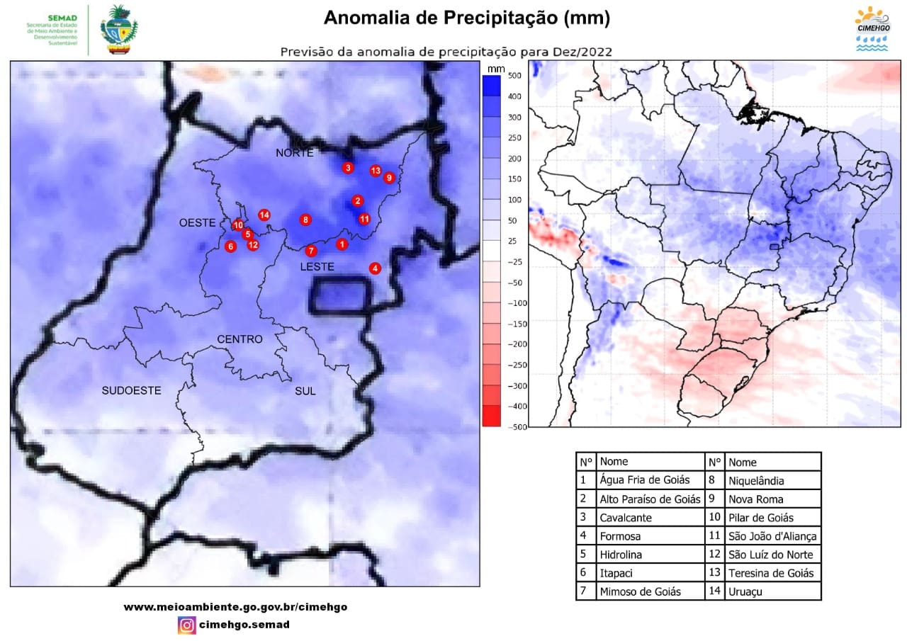 O relatório do Cimehgo indica que até o final de dezembro as chuvas tendem a ser intensas em todo o Estado, mas os maiores alertas são para Água Fria de Goiás, Alto Paraíso de Goiás, Cavalcante, Formosa, Hidrolina, Itapaci, Mimoso de Goiás, Niquelândia, Nova Roma, Pilar de Goiás, São João d’Aliança, São Luiz do Norte, Teresina de Goiás e Uruaçu. Juntos, todos esses municípios podem acumular até 700 milímetros de precipitação até o início de 2023.
