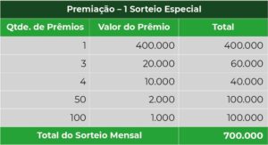 1 – Todo mês será sorteado um total de R$ 200 mil, divididos entre 158 prêmios: um de R$ 50 mil; três de R$ 10 mil; quatro de R$ 5 mil: 50 de R$ 1 mil e 100 prêmios de R$ 500,00. Já no sorteio anual, serão premiados 158 consumidores, sendo o maior prêmio no valor de R$ 400 mil. Os demais prêmios especiais serão o dobro do valor pago no sorteio mensal. “Tudo que o consumidor precisa para concorrer é ser cadastrado no programa e exercer seu direito de pedir na hora da compra o CPF na nota fiscal”, afirma o coordenador do Programa, Leonardo Vieira de Paula. Confira os prêmios nas tabelas abaixo.