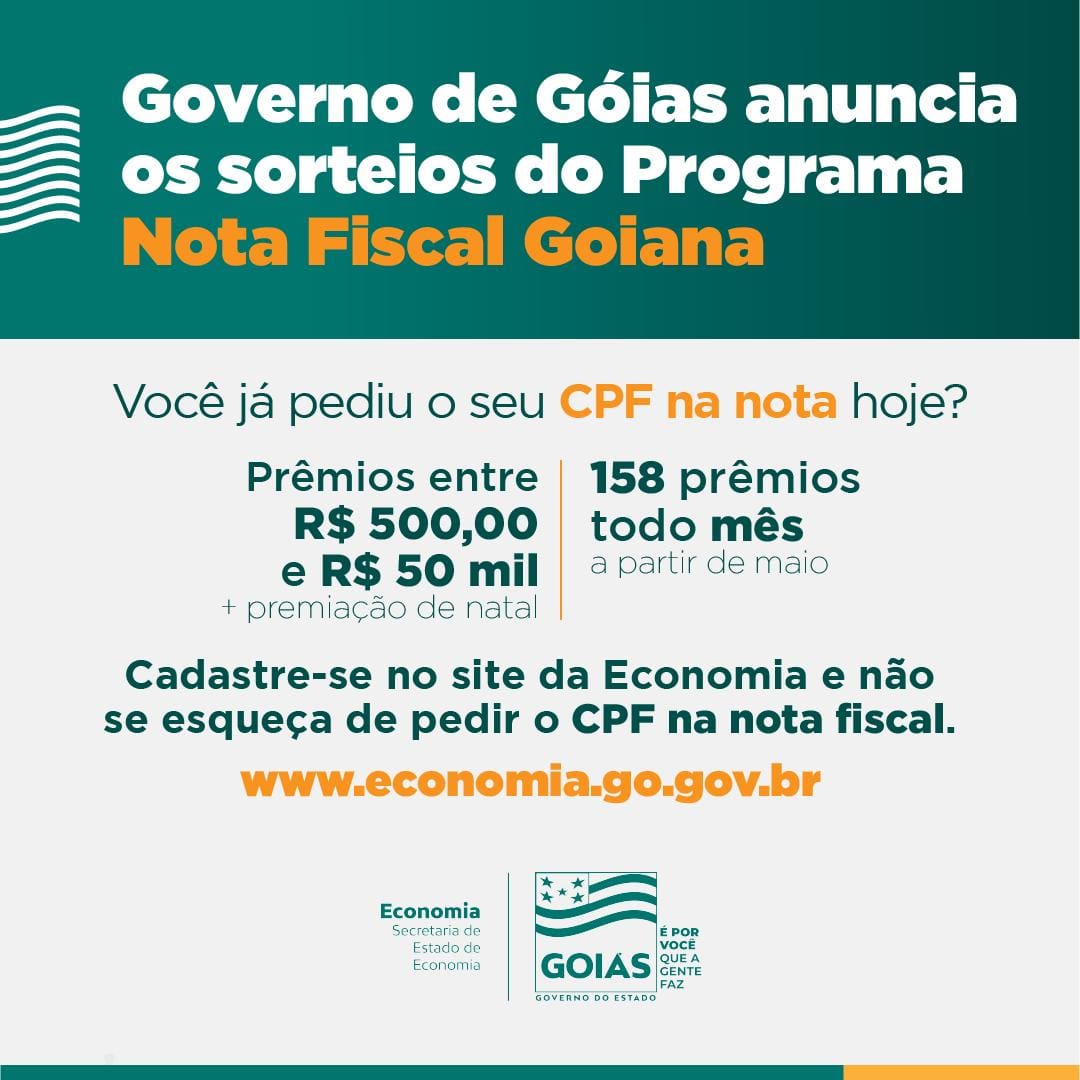A Secretaria da Economia de Goiás informa que já tem data os sorteios de prêmios, em dinheiro, do Programa Nota Fiscal Goiana. Quem pedir o CPF na nota a partir desse mês de março e estiver cadastrado no site da Secretaria da Economia, já começa a pontuar para o primeiro sorteio previsto para a última semana de maio. Serão sorteados todo mês 158 consumidores, que ganharão prêmios entre R$ 500,00 e R$ 50 mil. Além disso, haverá sorteios especiais no final do ano com prêmios de até R$ 400 mil.