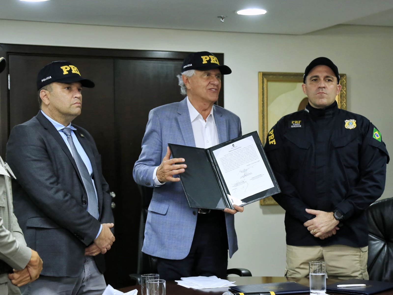 Com o objetivo de facilitar os sistemas de comunicação e inteligência as polícias e reforçar a segurança pública, o governador Ronaldo Caiado assinou um termo de cooperação técnica entre as forças de segurança estaduais e a Polícia Rodoviária Federal (PRF) de Goiás e do Distrito Federal (DF), na tarde desta terça-feira (05/12).