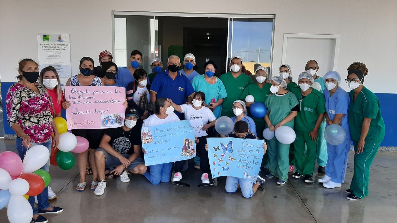 No dia da alta, os familiares se juntaram para homenagear os profissionais de saúde que cuidaram tão bem de Vilma. Carregando balões e um cartaz, todos agradeceram pelos cuidados e pelo carinho recebido durante o tratamento, que teve início no dia 19 de maio e durou até o dia 3 de junho.