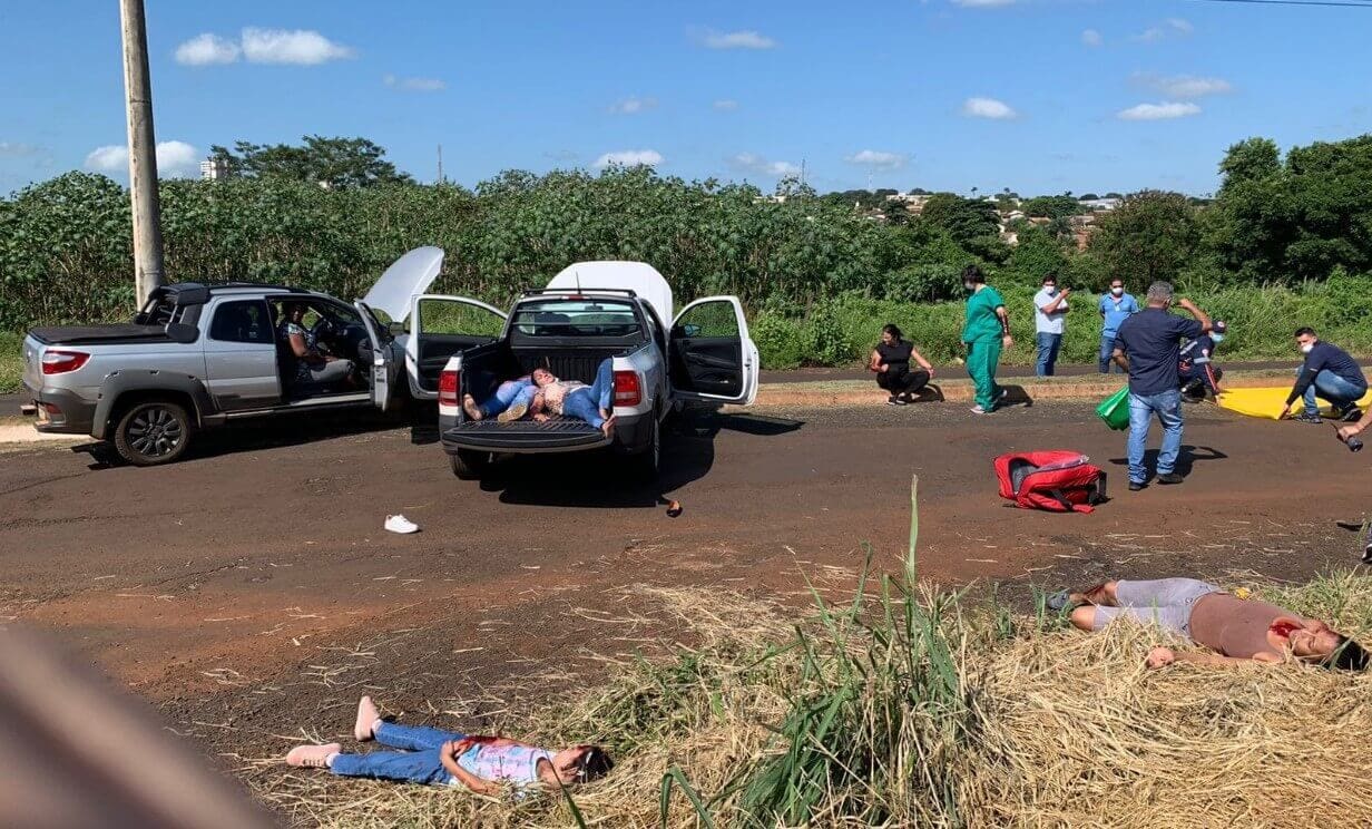 Foi representada uma colisão frontal de duas caminhonetes que levavam dois passageiros nas carrocerias, o que ocasionaria o arremesso dessas pessoas – o Código de Trânsito Brasileiro (CTB) proíbe o transporte de passageiros dessa maneira.