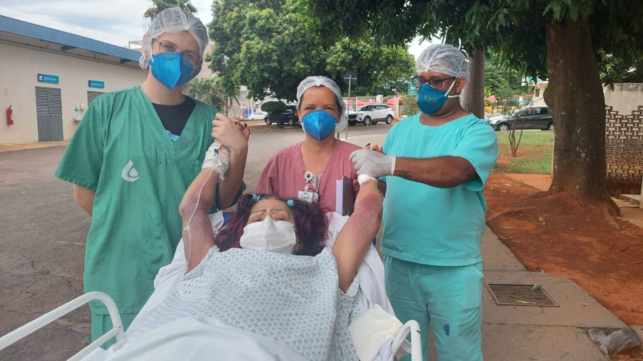 Após 38 dias internada no Hospital Estadual de Urgências de Goiás Dr. Valdemiro Cruz (Hugo), Marli de Fátima Rosa, de 60 anos, sentiu por alguns minutos o calor do sol e o ar fresco no rosto. A paciente pôde sair para área externa, acompanhada da equipe multiprofissional da unidade do Governo de Goiás.