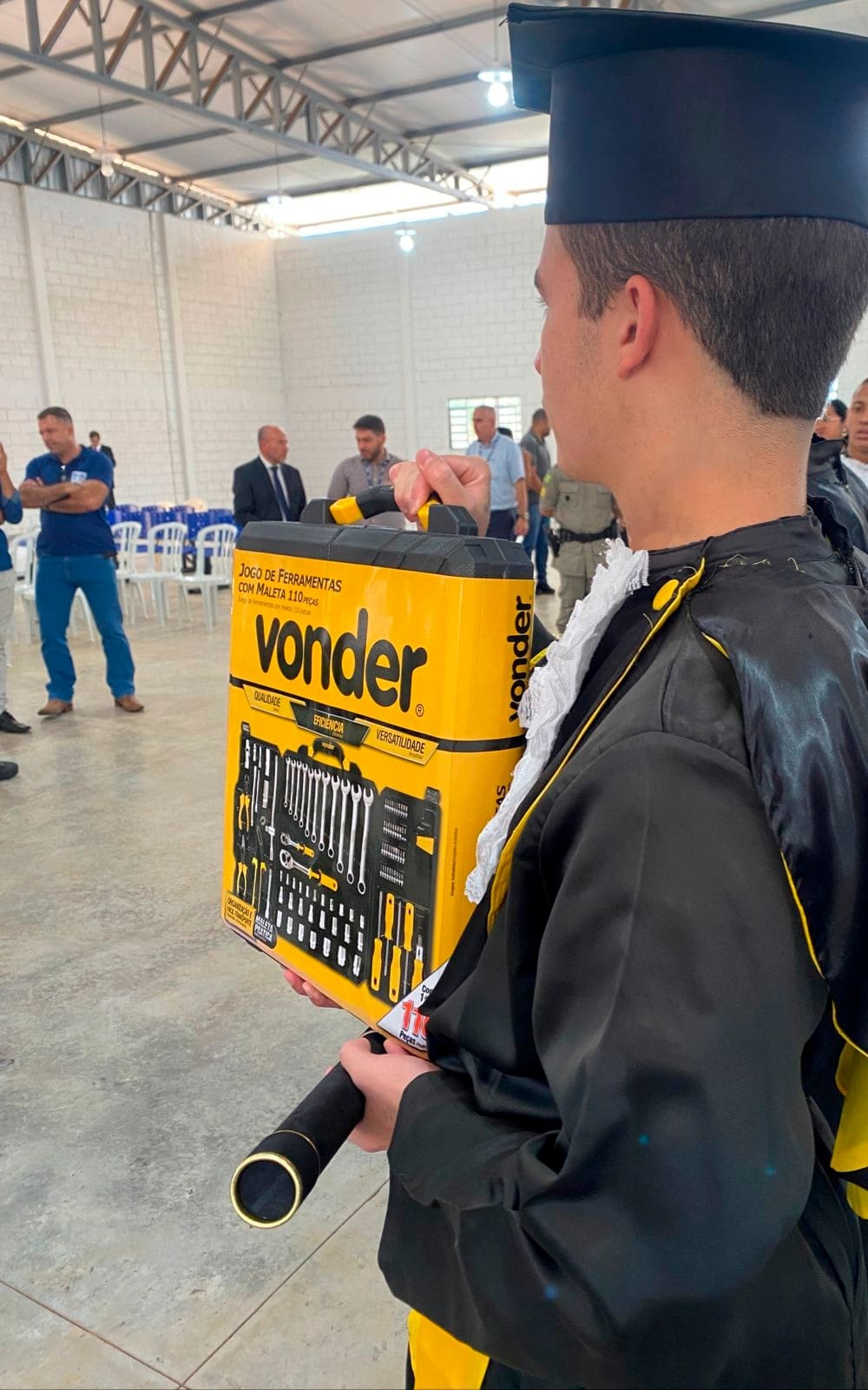 As ferramentas adquiridas com o Crédito Social foram entregues aos socioeducandos durante a formatura. O equipamento será utilizado quando eles iniciarem o trabalho na área, após cumprimento do período de internação.