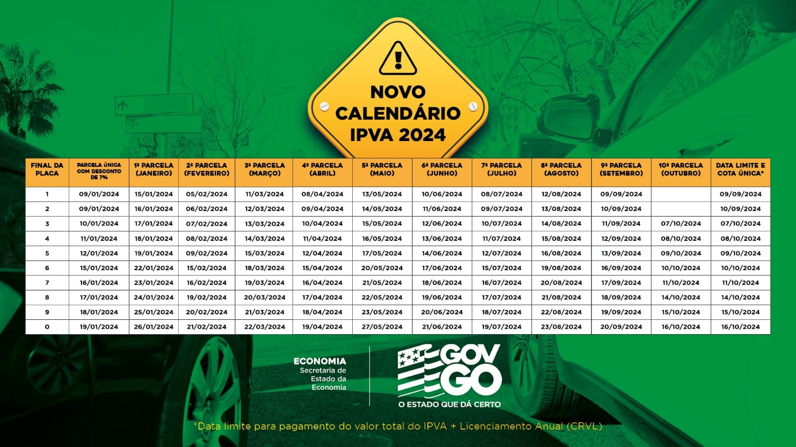 O calendário de vencimentos do IPVA 2024 em Goiás continua na próxima segunda-feira (15/1) e está disponível para consulta no site da Economia. Neste ano, os donos de veículos que efetuarem o pagamento do valor total em janeiro, conforme o calendário, terão redução de 7% no imposto, além do percentual acumulado por meio da Nota Fiscal Goiana.