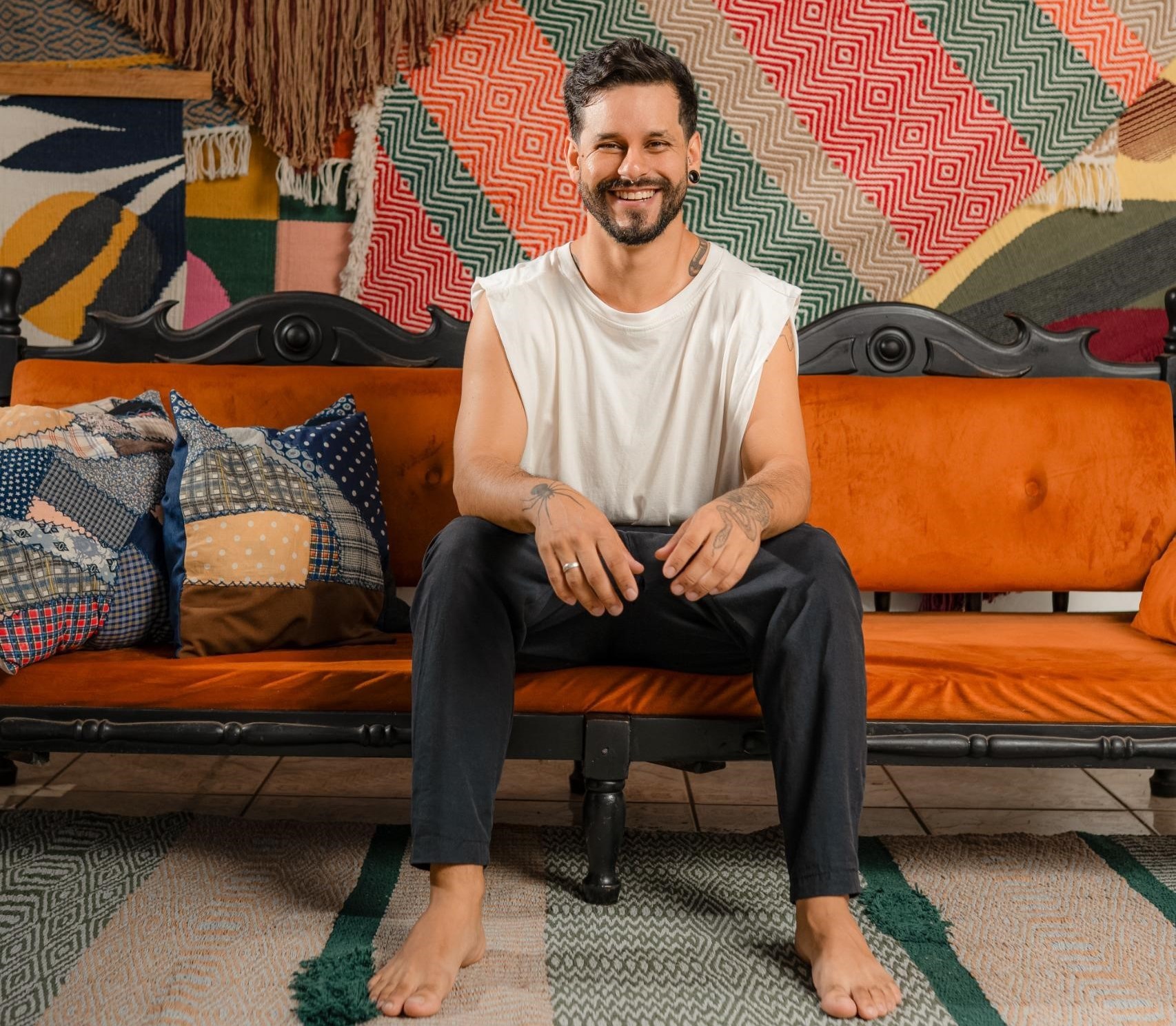 Atualmente, o artesão desenvolve tapeçarias utilizando técnicas tradicionais como o Kilim e a leitura de padronagens gráficas, em um tear de pedal que projetou e ajudou a construir com as próprias mãos. Valoriza processos sustentáveis utilizando, principalmente, os barbantes de algodão reciclado.