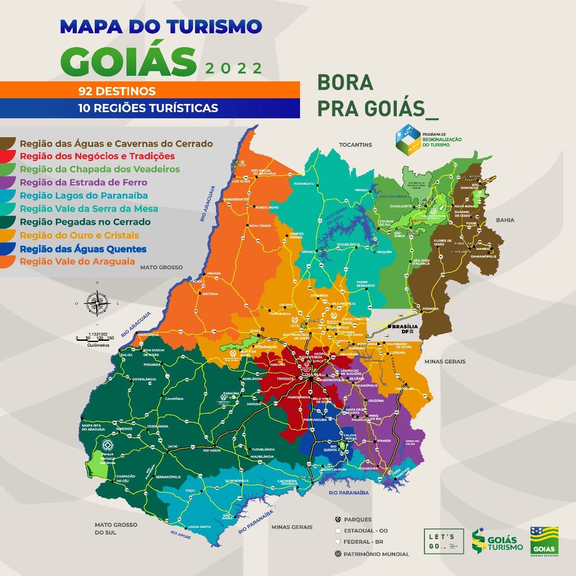 O Governo de Goiás, por meio da Goiás Turismo, divulgou nesta segunda-feira (28) o novo Mapa do Turismo, que passa a contar com 92 municípios, distribuídos em 10 regiões turísticas (Vale do Araguaia, Ouro e Cristais, Chapada dos Veadeiros, Negócios e Tradições, Pegadas no Cerrado, Estrada de Ferro, Lagos do Paranaíba, Águas e Cavernas do Cerrado, Vale da Serra da Mesa e Águas Quentes). De acordo com a Agência Estadual de Turismo, seis cidades saíram e outras 19 entraram para o Mapa. A listagem anterior contava com 79 destinos.