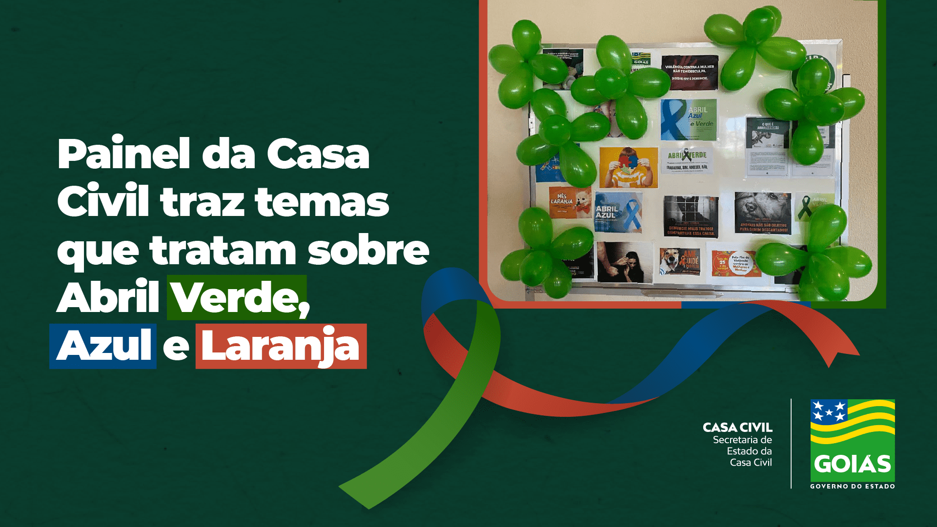 A Secretaria de Estado da Casa Civil, juntamente com o Comitê Permanente para Questões da Mulher e da Diversidade e com a Comissão Interna de Prevenção de Acidentes, organiza neste mês um mural com as pautas Abril Verde, Azul e Laranja, que trata sobre prevenção, segurança e saúde no trabalho; Dia Mundial de Conscientização do Autismo e prevenção contra a crueldade animal, respectivamente.