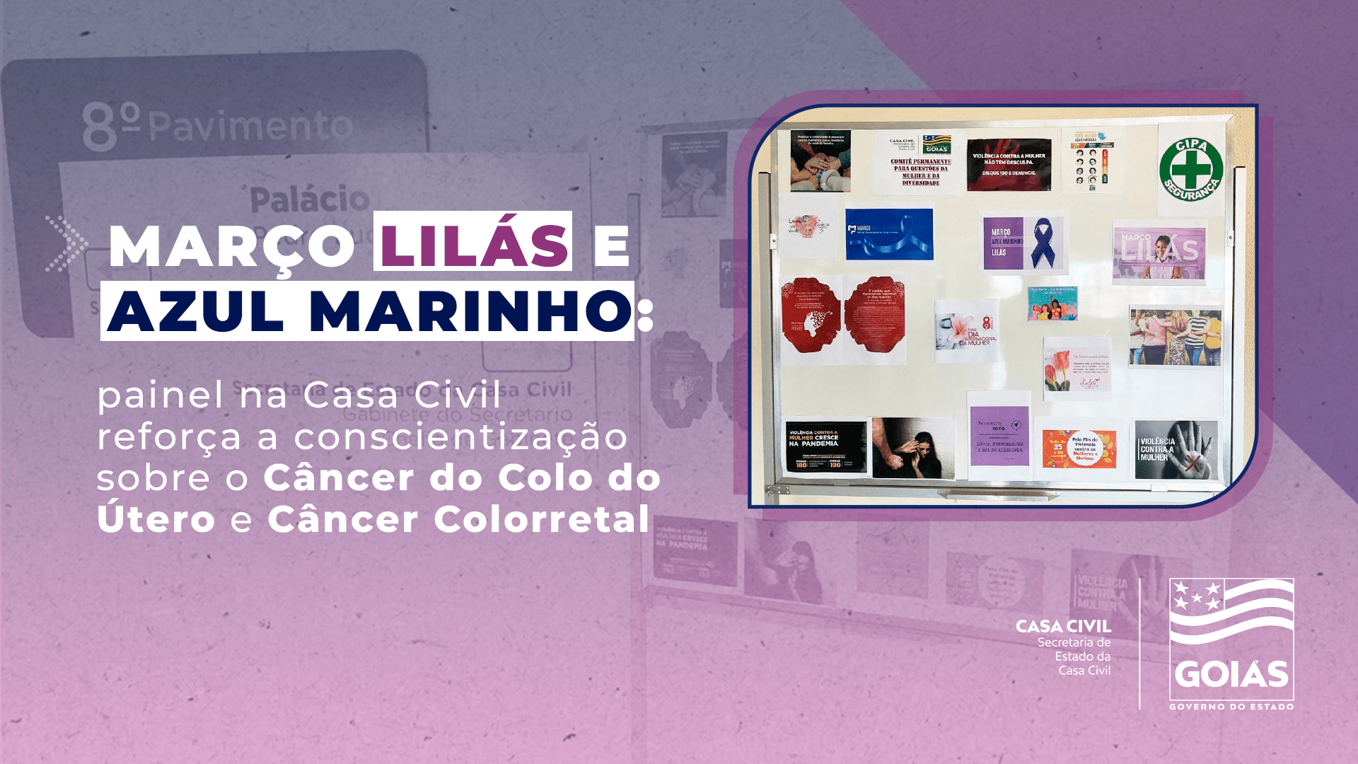 A Secretaria da Casa Civil, juntamente com o Comitê Permanente para Questões da Mulher e da Diversidade e com a Comissão Interna de Prevenção de Acidentes, organiza neste mês um mural com as pautas do Março Lilás e Azul Marinho, que tratam, respectivamente, da prevenção câncer do colo de útero e câncer colorretal. Além de ser comemorado o Dia Internacional da Mulher.