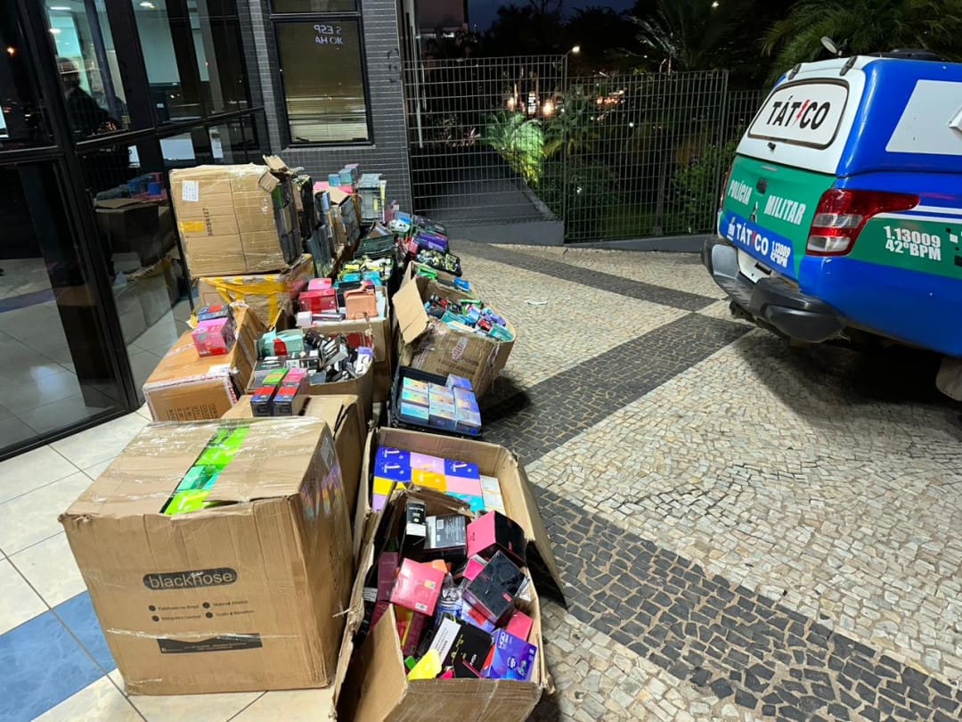 A Polícia Militar de Goiás, por meio da equipe do Tático do 42º BPM, apreendeu cerca de 10 mil produtos, entre aparelhos de cigarros eletrônicos e essências, em Goiânia. Os produtos, provenientes do Paraguai, foram localizados pela corporação em uma tabacaria que os comercializava de forma ilegal, no Setor Urias Magalhães.