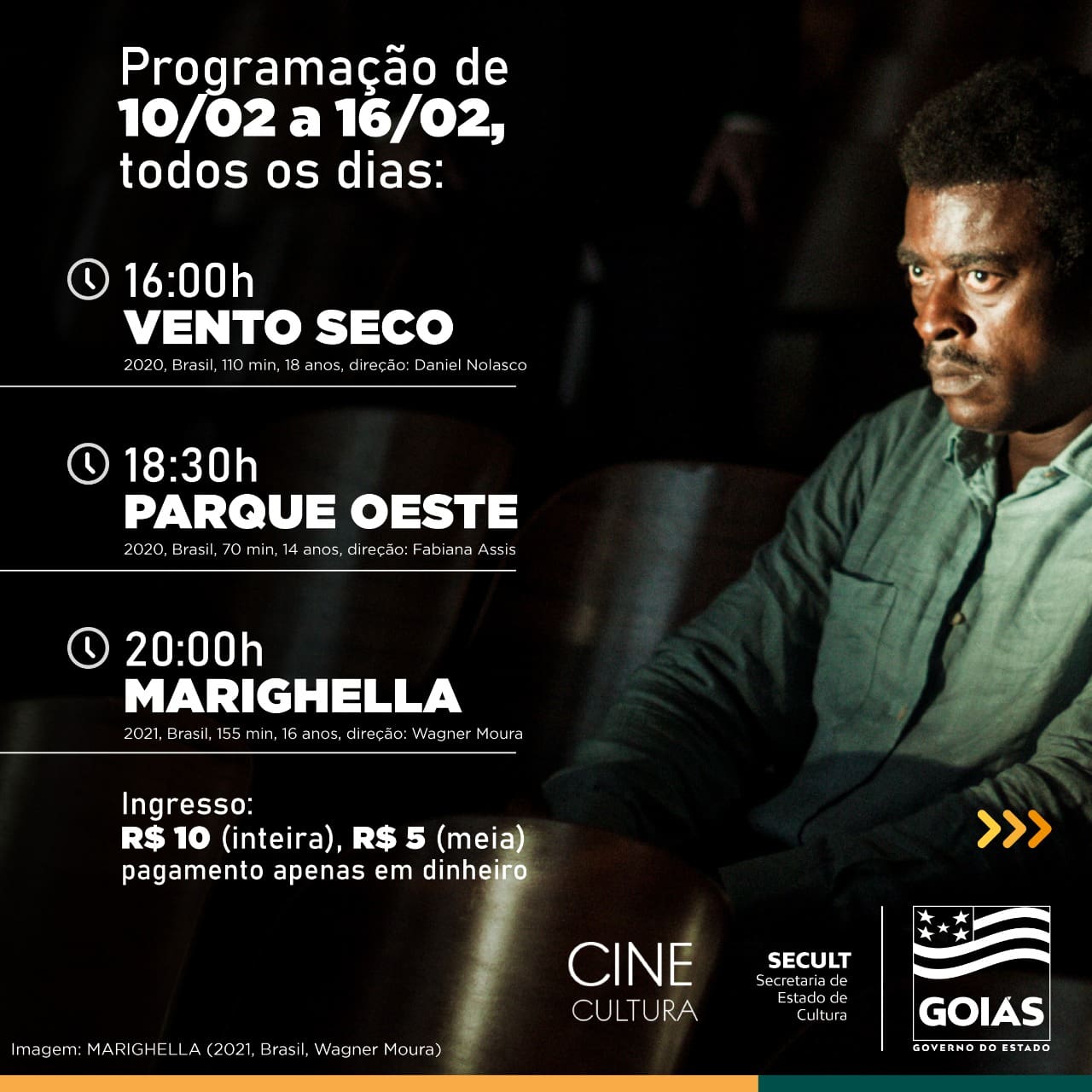 O Cine Cultura, unidade da Secretaria do Estado de Cultura (Secult Goiás), segue com filmes em cartaz até o próximo dia 16, cujo roteiro traz duas produções goianas, Parque Oeste e Vento Seco, e uma produção nacional dirigida por Wagner Moura, Marighella. A programação, que teve início no dia 01 de fevereiro, segue até esta quarta-feira, dia 9, já os novos horários passam a valer a partir do dia 10.